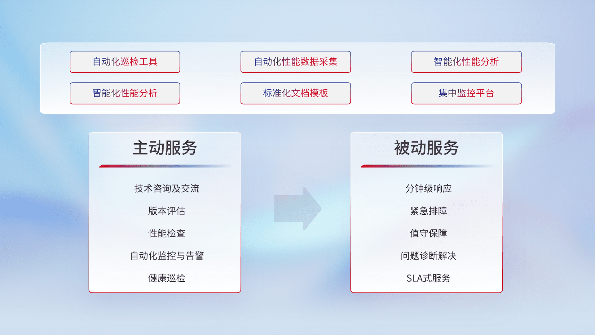 智能化工具和标准化文档,,,,保障服务质量,,,提供主动服务(包含技术咨询、、版本评估、、性能检查、、自动化监控与告警、、、、健康巡检)和被动服务包含(分钟级响应、、紧急排障、、、值守保障、、问题诊断解决、、、SLA服务)。。。